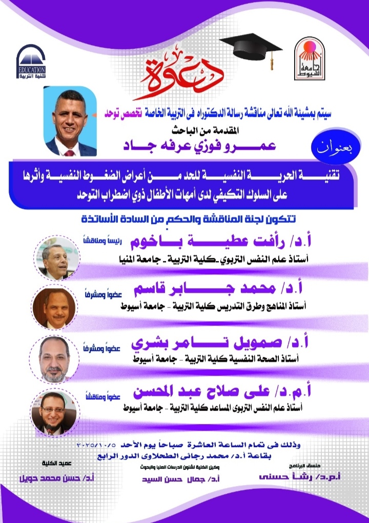 باحث من أسيوط يناقش رسالة دكتوراه حول ”تقنية الحرية النفسية للحد من الضغوط النفسية لدى أمهات أطفال التوحد”