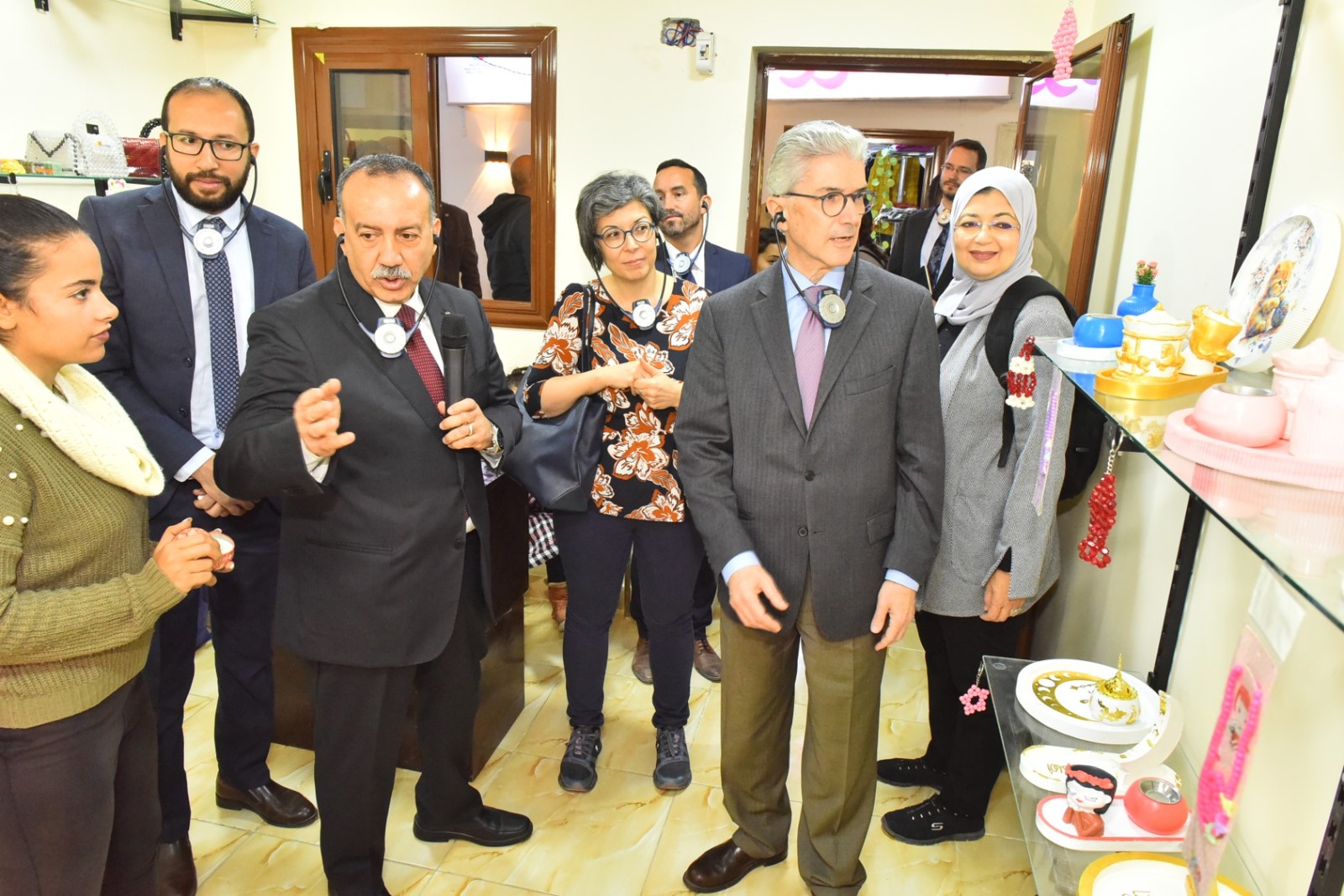 "محافظ أسيوط'، جولاته التفقية برفقه وفد رفيع المستوى من مشروع "دعم الاتحاد الأوروبي للتجارة والصناعة – تجارة TIGARA"، برئاسة الدكتور نيكولاس زايميس، رئيس قسم الاستثمار والتجارة بمفوضية الاتحاد الأوروبي بالقاهرة، وبمشاركة ممثلين عن منظمة الأمم المتحدة للتنمية الصناعية (اليونيدو) ووزارة التنمية المحلية حيث زار بازار "كيان" الكائن أسفل كوبري فيصل بحي غرب، للاطلاع على تجربة المحافظة في تحويل المواقع غير المستغلة إلى وحدات إنتاجية تدعم الشباب والأسر المنتجة.
