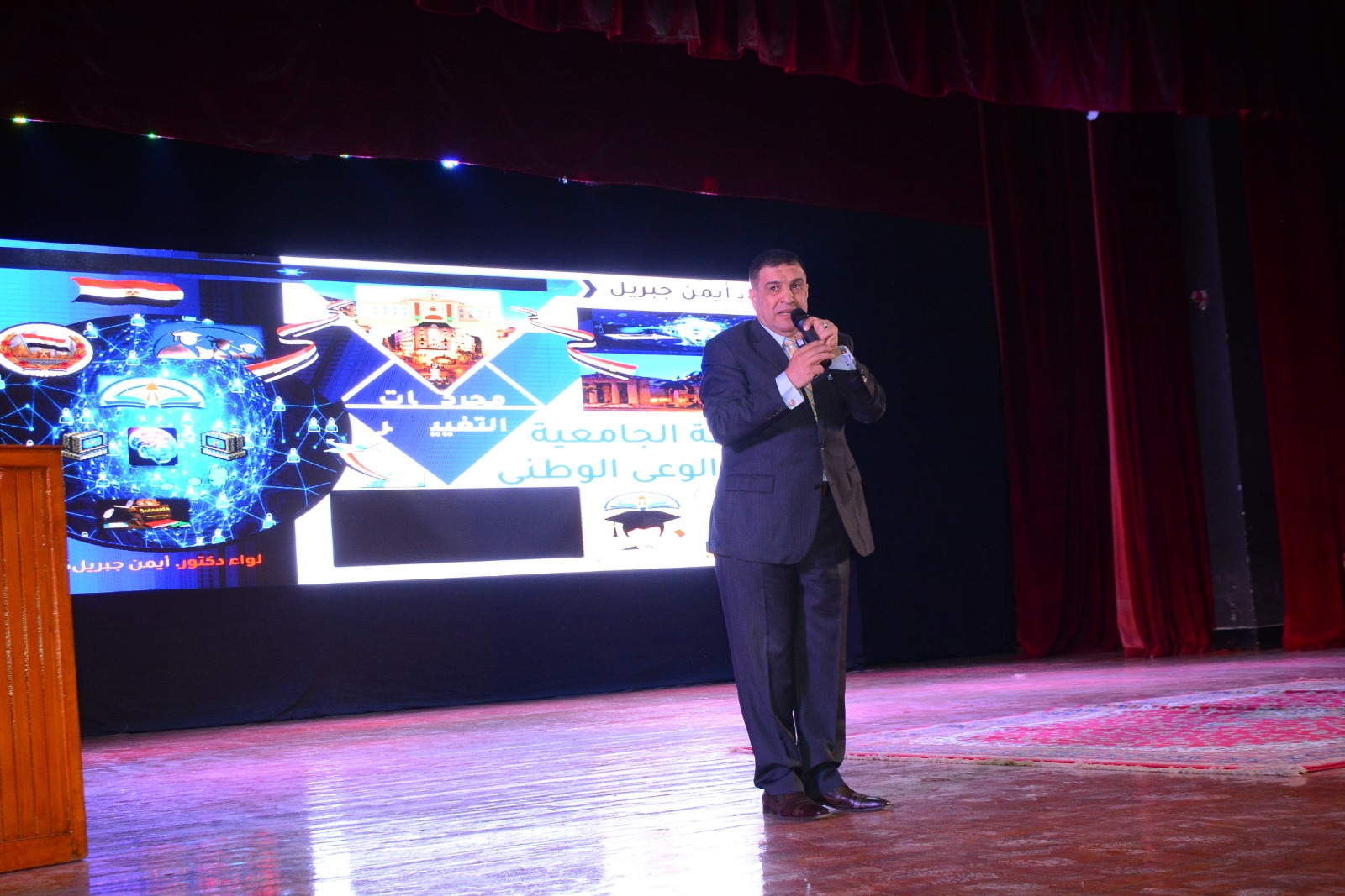 وخلال محاضرته حول "الثقافة الجامعية وبناء الوعي الوطني"، أوضح اللواء أيمن عبد الله جبريل أن ترسيخ الوعي هو الركيزة الأساسية لبناء إنسان مثقف وواعٍ لما يدور حوله من أحداث، وفاعل حقيقي في نهضة الوطن واستقراره، لافتًا إلى أن الشباب الجامعي هو المستهدف في معركة الوعي، وهو ما يؤكد دور الوعي الوطني في تحقيق التنمية الشاملة، وضمان استقرار الدولة من خلال مواجهة الأفكار الهدامة، وتعزيز الهوية الوطنية، ومقاومة الشائعات.