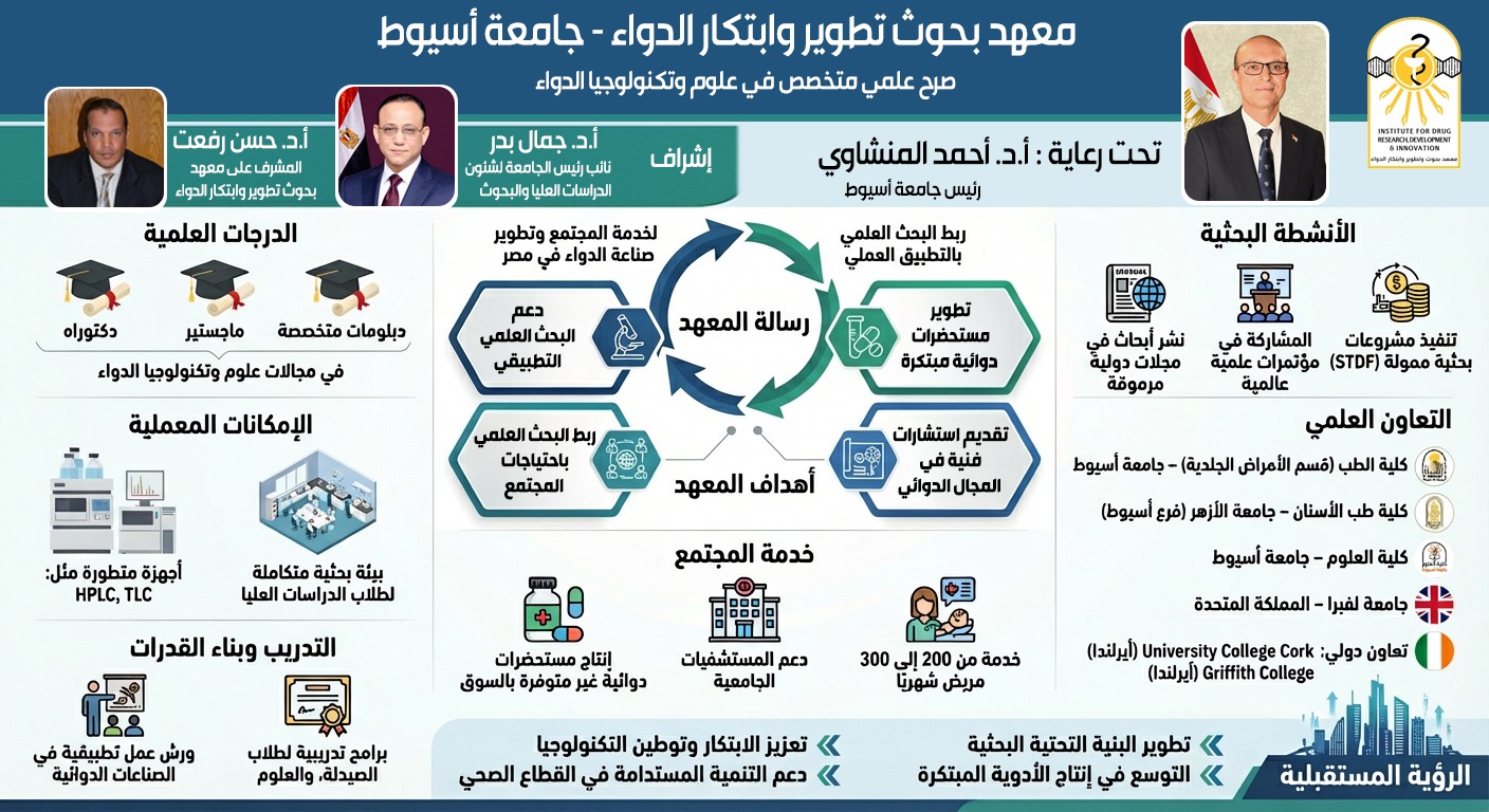 في إطار توجه جامعة أسيوط نحو تعزيز البحث العلمي التطبيقي ومواكبة التطورات العالمية في قطاع الصناعات الدوائية، وتحت رعاية الدكتور أحمد المنشاوي رئيس جامعة أسيوط، يواصل معهد بحوث وتطوير وابتكار الدواء ترسيخ مكانته كأحد الصروح العلمية المتخصصة التي تسهم في تطوير الدواء وخدمة المجتمع، من خلال منظومة متكاملة تجمع بين البحث العلمي والخدمات التطبيقية والتدريب، وذلك بإشراف الدكتور جمال بدر، والدكتور حسن رفعت المشرف على معهد بحوث وابتكار الدواء.
