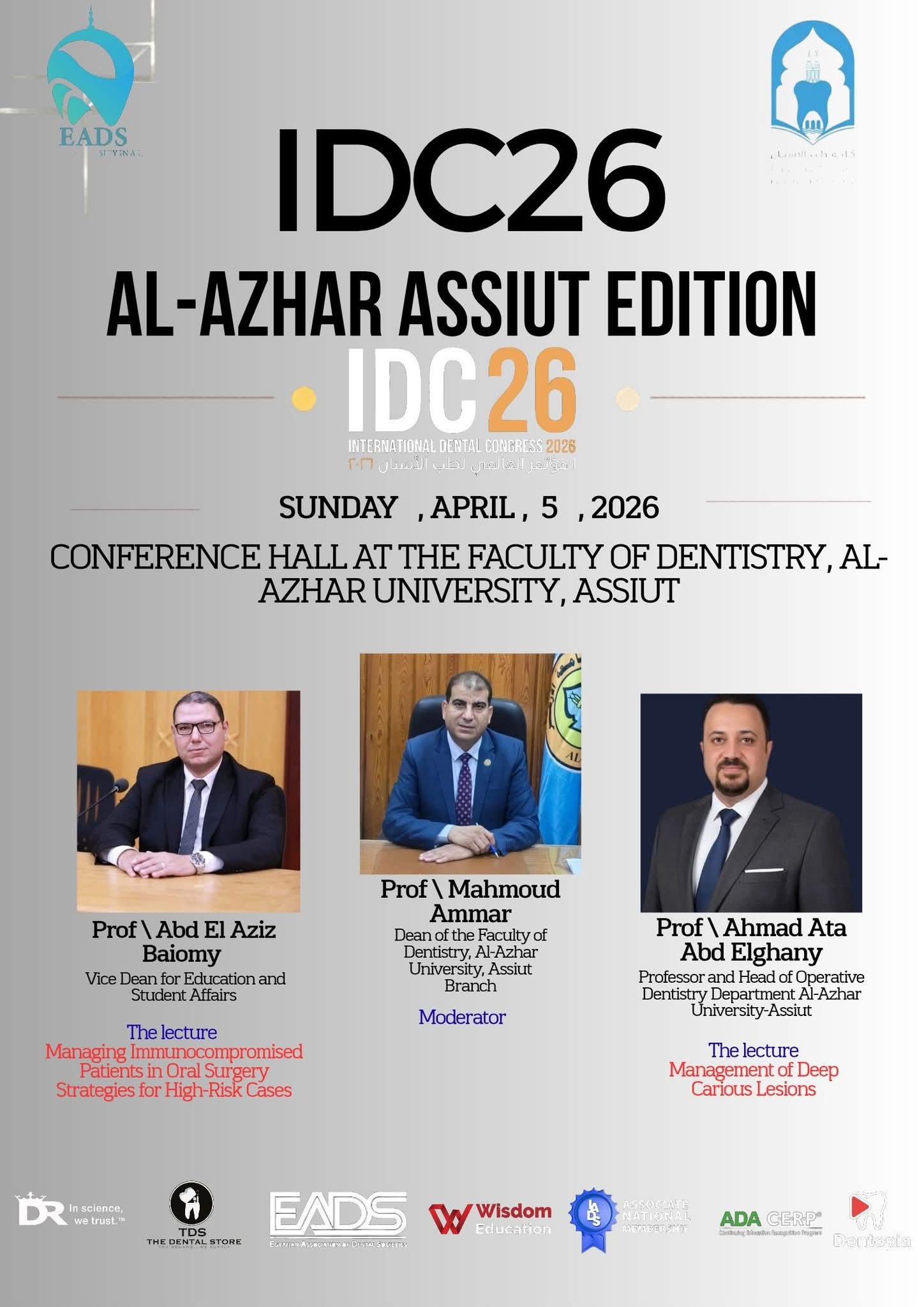 برعاية فضيلة الأستاذ الدكتور سلامة داود، رئيس جامعة الأزهر، وفضيلة الأستاذ الدكتور محمد عبد المالك، نائب رئيس الجامعة للوجه القبلي، تنظم كلية طب الأسنان بجامعة الأزهر بأسيوط، برئاسة الأستاذ الدكتور محمود عمار، عميد الكلية، يوماً علمياً لوحدة التعليم المستمر، بالتعاون مع الاتحاد المصري للجمعيات العلمية لطب الأسنان، وذلك يوم الأحد الموافق 5 أبريل 2026.