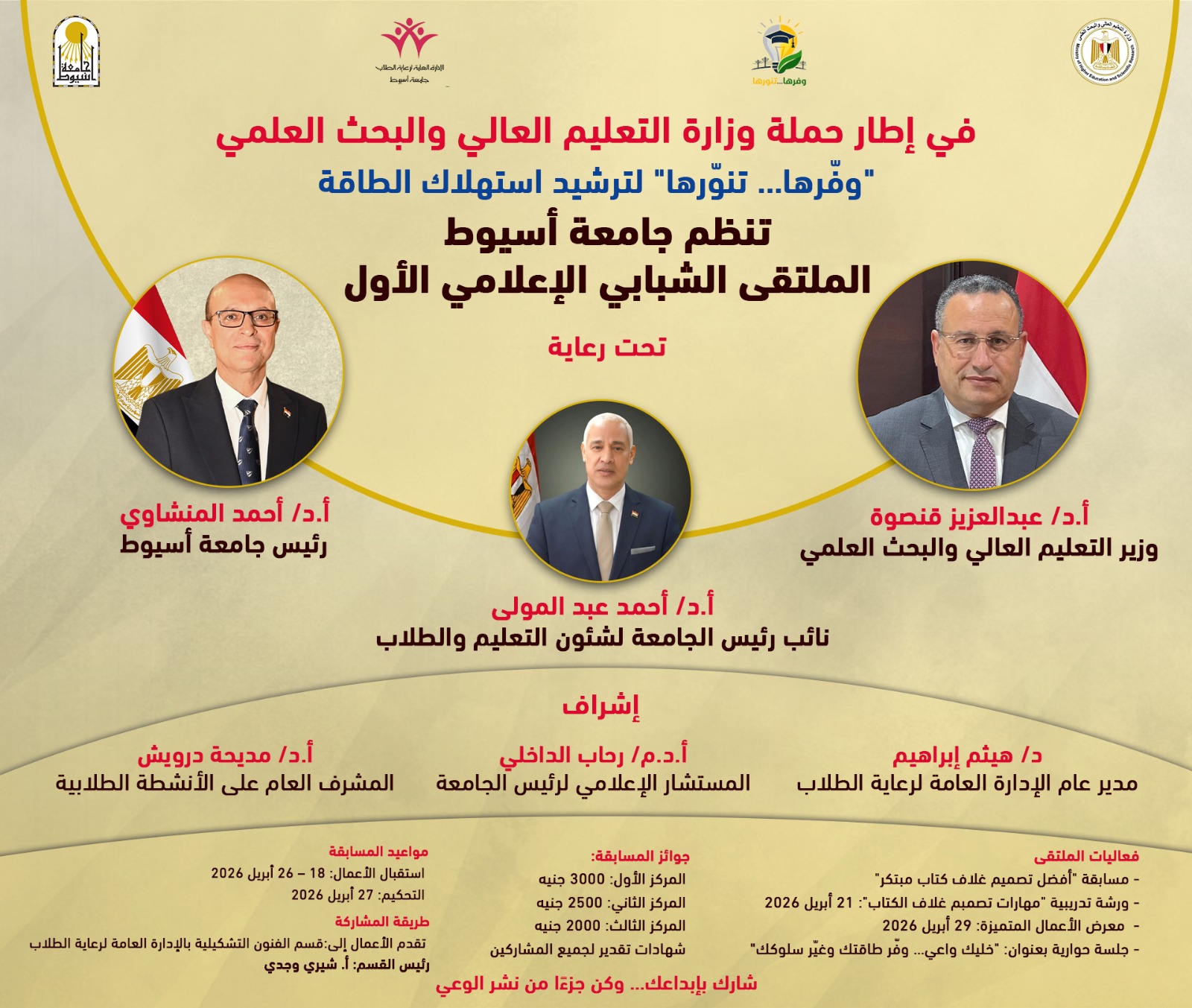 تحت رعاية الدكتور عبدالعزيز قنصوة، وزير التعليم العالي والبحث العلمي، والدكتور أحمد المنشاوي، رئيس جامعة أسيوط، تعلن الجامعة عن إطلاق مسابقة طلابية بعنوان «أفضل تصميم غلاف كتاب»، وذلك في إطار مشاركتها في الحملة التي أطلقتها وزارة التعليم العالي والبحث العلمي لترشيد استهلاك الطاقة تحت شعار «وفّرها… تنوّرها»، وضمن فعاليات الملتقى الشبابي الإعلامي الأول بجامعة أسيوط، المقرر عقده يوم 29 أبريل 2026.