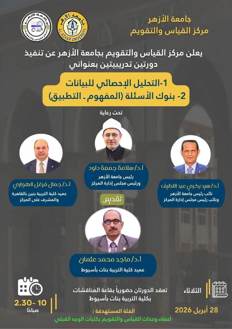 نظّمت كلية التربية بنات بجامعة الأزهر بأسيوط، بالتعاون مع مركز القياس والتقويم بالجامعة، دورتين تدريبيتين في مجال التحليل الإحصائي للبيانات وبنوك الأسئلة (المفهوم – التطبيق)، قدمهما الأستاذ الدكتور ماجد محمد عثمان، عميد كلية التربية بنات بأسيوط، لأعضاء وحدات القياس والتقويم بكليات الوجه القبلي، بمقر الكلية.